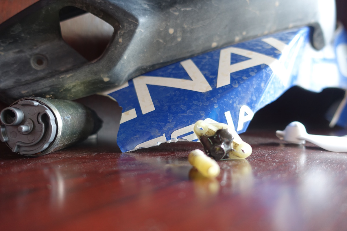 I pulled over as soon as I could and looked back up the road to pick up the shattered pieces of plastic that are meant for aesthetics as much as protecting the engine underneath. There was clearly some fluid on the road, but in the dark I couldn’t tell what it was, only that it didn’t smell like gasoline, and its viscosity was slicker than water. A little detective work showed that the radiator was hanging loose on the front of the bike, which is where the fluid seemed to be coming from.