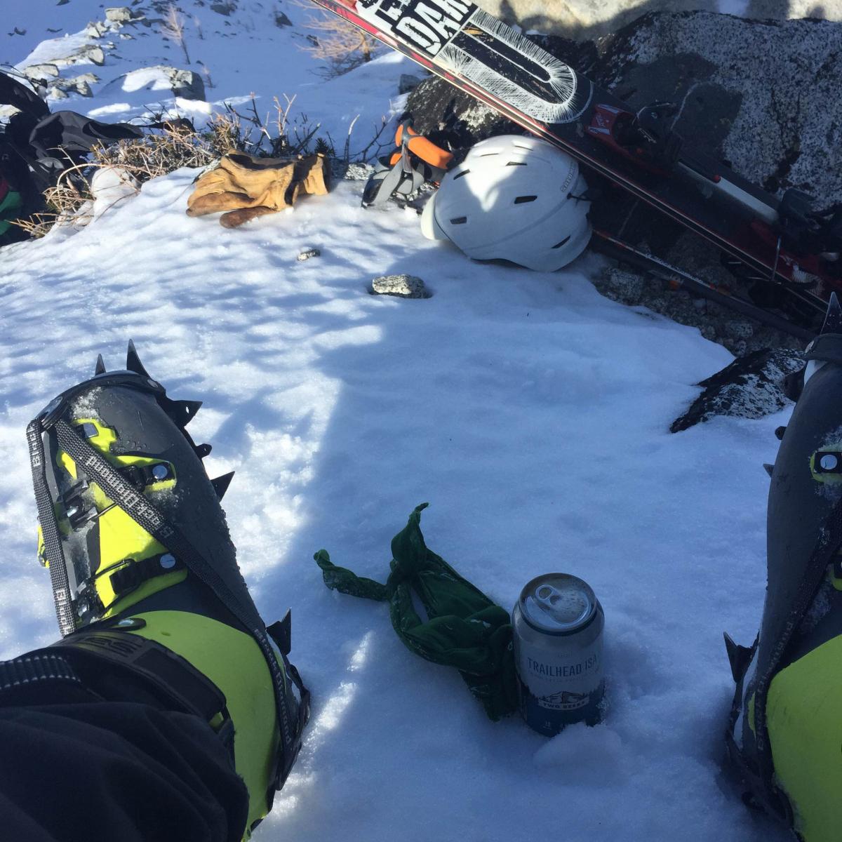 After a couple cups of coffee and the short drive, we meet in the parking lot at 6:00, grab a pair of snowshoes or throw some skins on the skis, and begin the hour-long hike from the base to the summit. When we finally reach the top, it is time for our “sacrament”: a frosty PBR is popped open and passed around as we watch the sunrise. The view from the summit is always worth the hike; the PBR, not so much. It’s more of a solidarity thing—as in, everyone shares in the universally bad flavor a PBR brings to the palate at 7:00 in the morning. Then we strap in and begin the quick but joyful run down to the car.